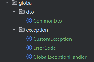 앞서API 개발에서 예외 처리는 클라이언트에게 발생한 오류의 원인을 명확히 전달하는 데 중요하다. 이를 통해 클라이언트는 문제를 신속하게 파악하고 해결할 수 있다. 예를 들어, 404 오류는 URI 입력 오류나 API 삭제 등 여러 원인으로 발생할 수 있으며, 이 경우 클라이언트에게 "잘못된 URI" 또는 "API가 삭제되었습니다"와 같은 구체적인 정보를 제공하는 것이 필요하다.이번엔 Custom Exception 처리를 통해 이러한 오류 메시지를 일관되게 제공하는 방법에 대해 알아보자.패키지 및 클래스 추가위와 같이 패키지 및 클래스를 추가하자.CommonDtopackage com.hkhong.study.global.dto;import com.hkhong.study.global.exception.Cus..